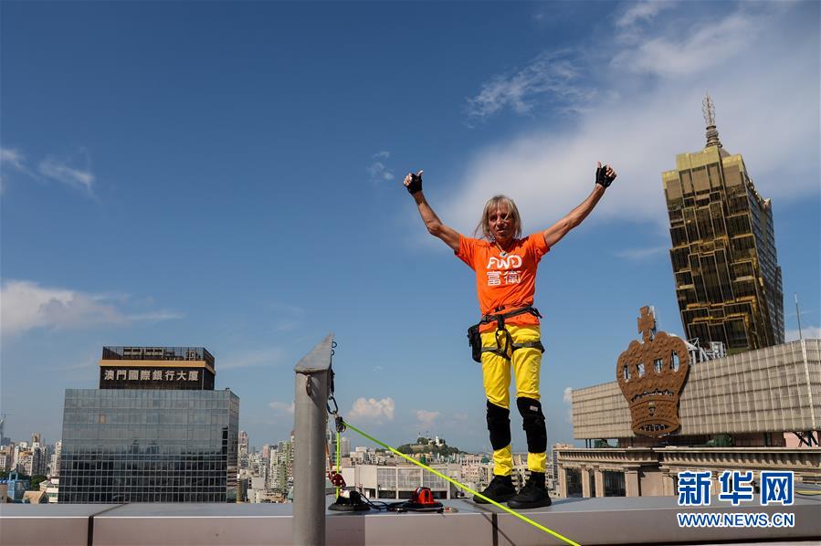 7月26日,阿蘭·羅伯特慶祝攀爬成功。當日,有“法國蜘蛛俠”之稱的徒手攀爬專家阿蘭·羅伯特成功攀登了位于澳門中區的財神商業中心大廈。 新華社記者 張金加 攝