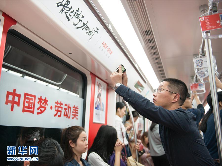 4月30日,一名乘客在“勞模專列”車廂內拍照。 “五一”勞動節期間,一列“勞模地鐵專列”亮相長沙地鐵1號線。該列車在車廂內集中展示了由全國勞模、攝影家謝子龍拍攝的88位不同崗位全國勞模的肖像作品,旨在展示“勞動最光榮、勞動最崇高、勞動最偉大、勞動最美麗”的精神。新華社發(陳思維 攝) -