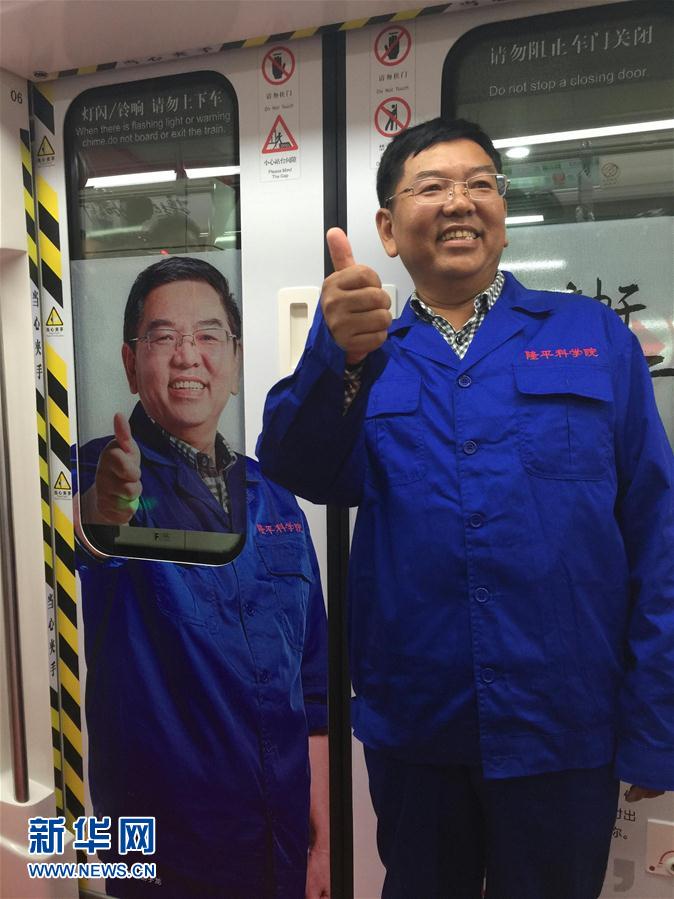 5月1日,全國勞動模范楊遠柱在“勞模地鐵專列”內與自己的肖像照片合影。 “五一”勞動節期間,一列“勞模地鐵專列”亮相長沙地鐵1號線。該列車在車廂內集中展示了由全國勞模、攝影家謝子龍拍攝的88位不同崗位全國勞模的肖像作品,旨在展示“勞動最光榮、勞動最崇高、勞動最偉大、勞動最美麗”的精神。新華社記者 明星 攝