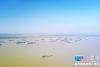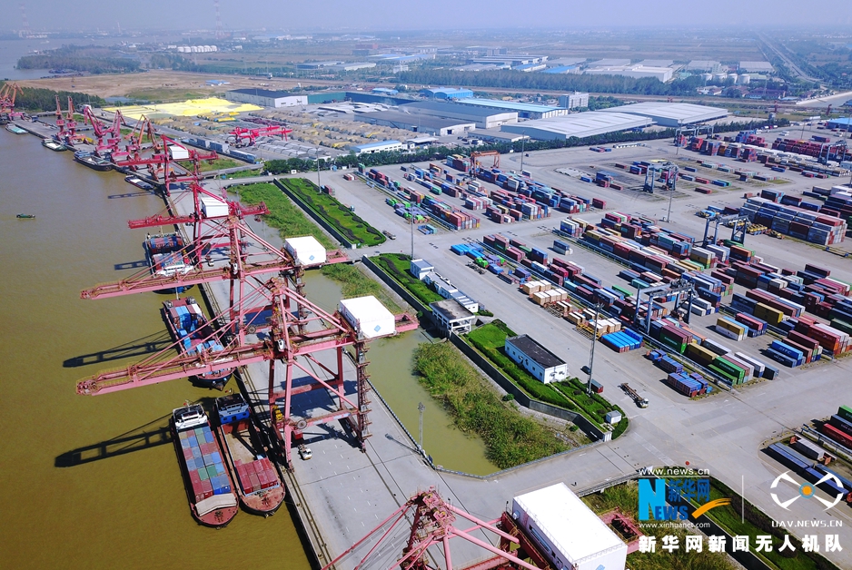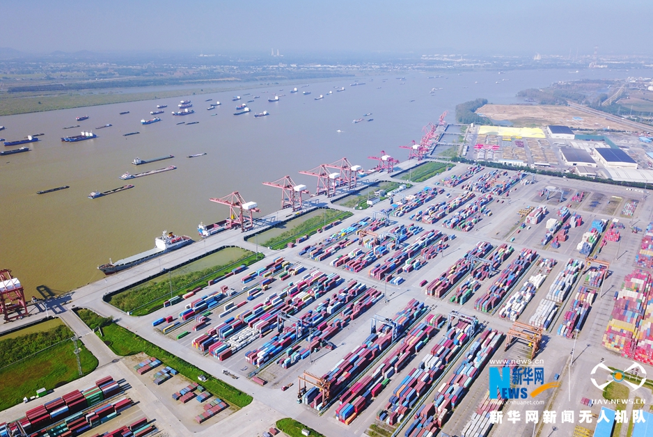 •   航拍長江上貨船往來,碼頭上集裝箱擺放有序,整箱待發(fā),一派繁忙的景象。 (新華網(wǎng) 席航飛)