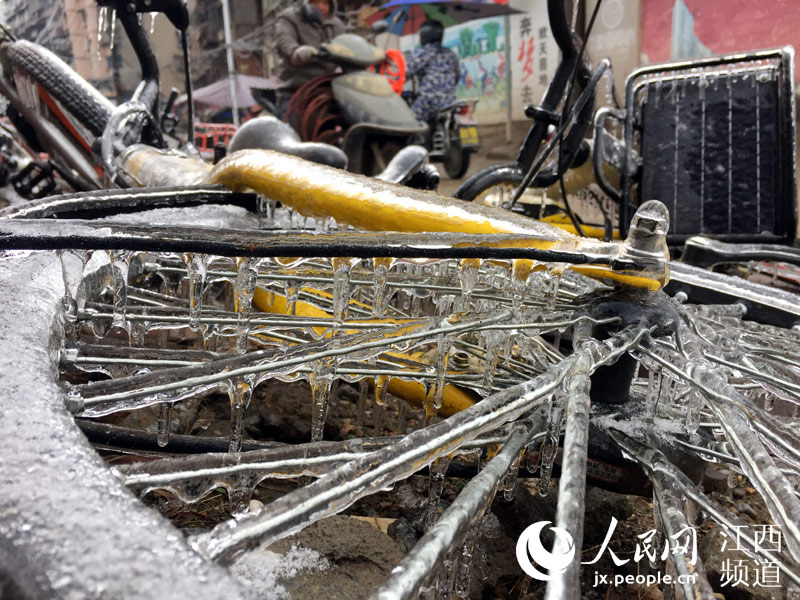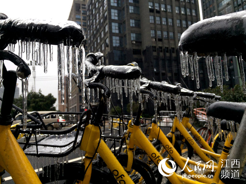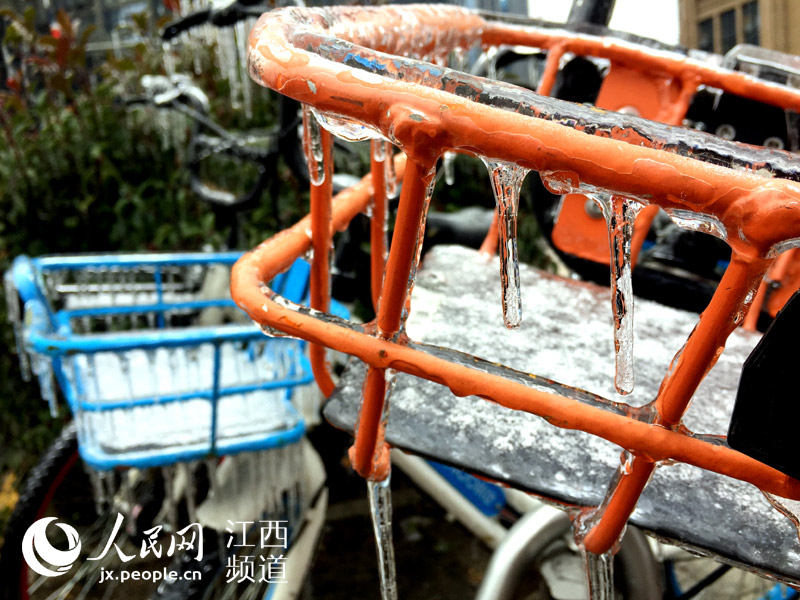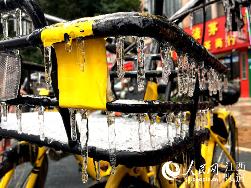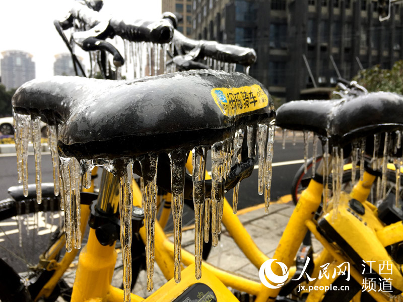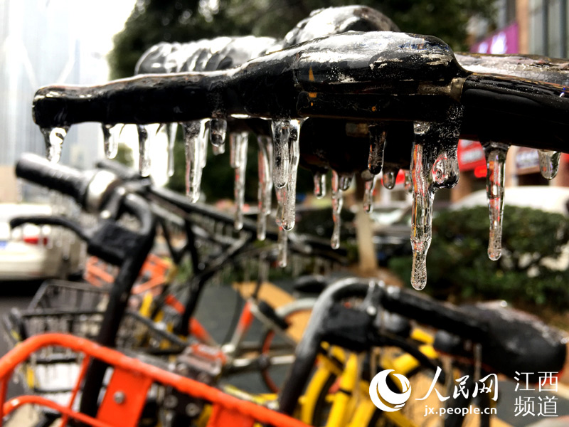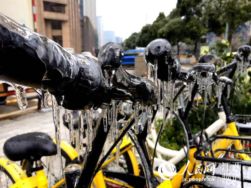 人民網南昌1月28日電(時雨)連日來,南昌遭遇低溫凍雨天氣,夜間的溫度跌至0℃以下。28日,本網在南昌街頭看到,低溫加凍雨使戶外的物體裹上了厚厚的“冰衣裳”,散落在街頭的各類共享單車不少已經成為“冰雕”,車把手、車筐甚至車輪胎都結了冰,這些被“冰封”的共享單車停靠在路邊無人問津。