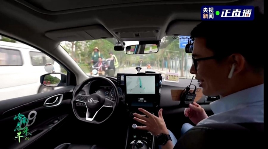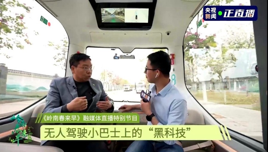 直播中,總臺記者走進同時落地無人駕駛汽車和無人駕駛巴士的廣州生物島,使用手機軟件叫車,一路分享新鮮體驗感受,并與自動駕駛領軍企業文遠知行首席運營官張力暢談無人駕駛技術里的“黑科技”。
