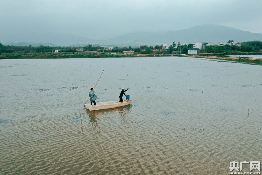 養殖戶正在投喂蝦食。(央廣網記者 官文清攝)