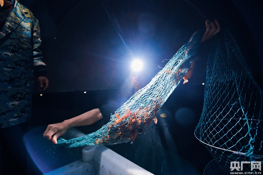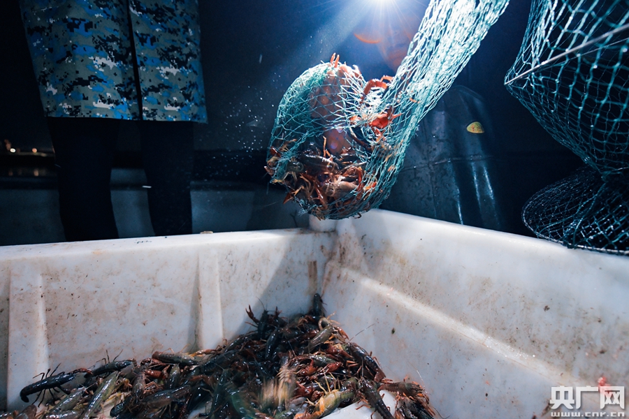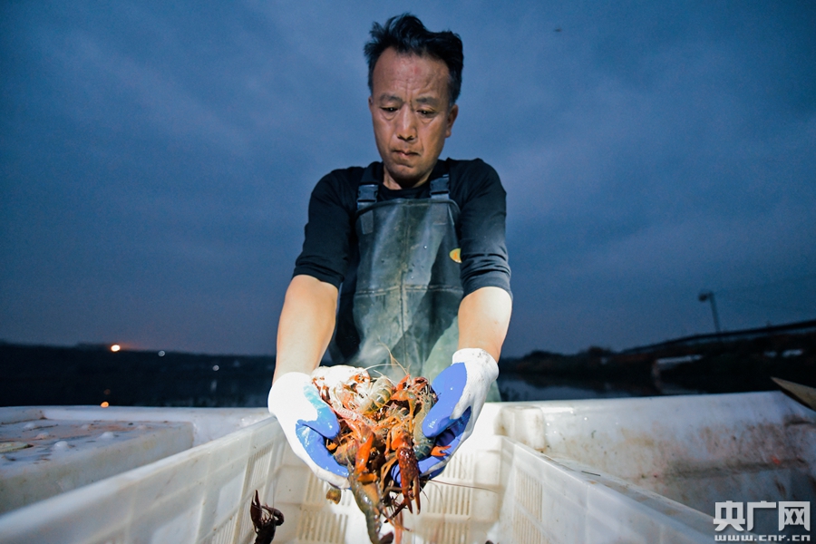 為了能讓小龍蝦盡早端上消費者的餐桌,養殖戶需要在凌晨將小龍蝦捕撈上岸。(央廣網記者 官文清攝)