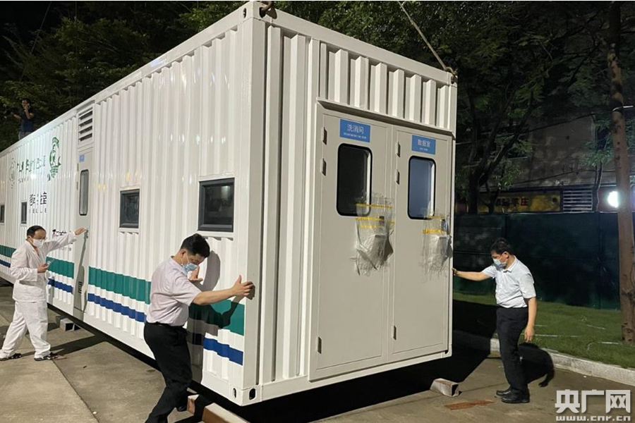 工作人員對“移動方艙實驗室”進行安裝調試。(央廣網發 通訊員供圖)