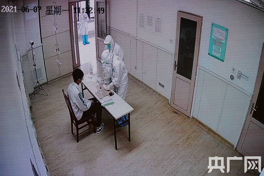 醫護人員為隔離考生處理考試用品。(央廣網記者官文清 攝)