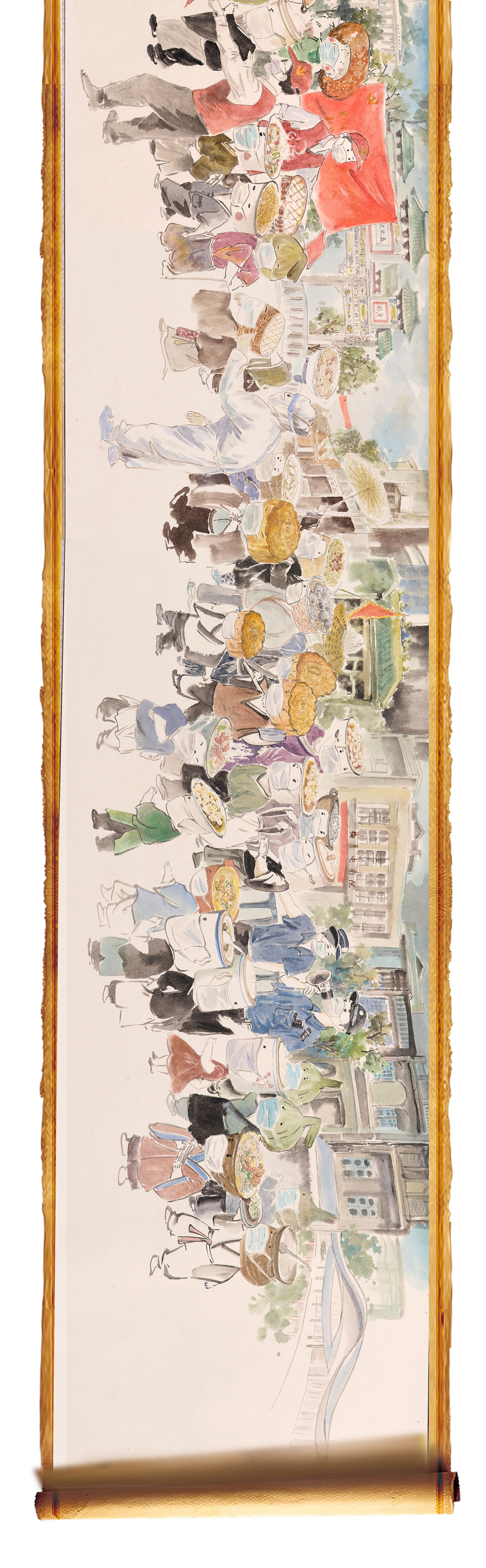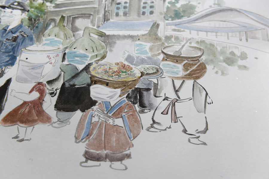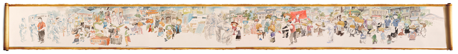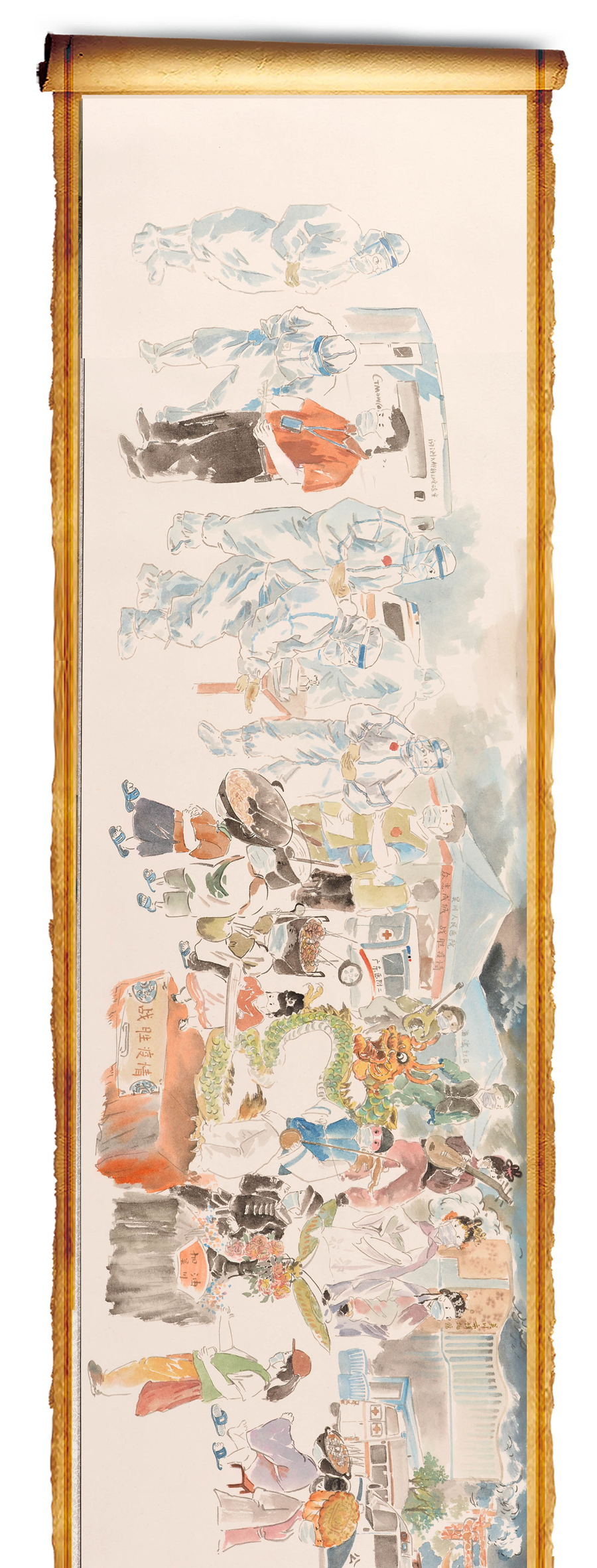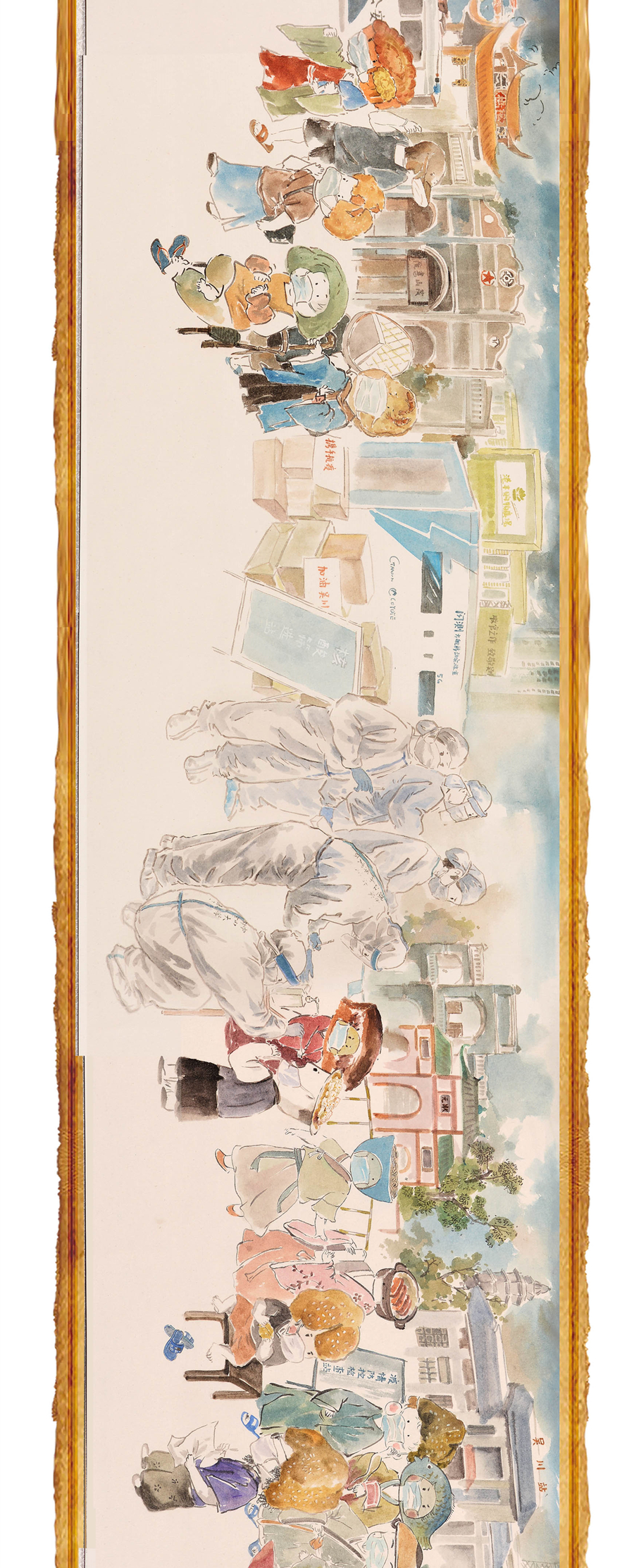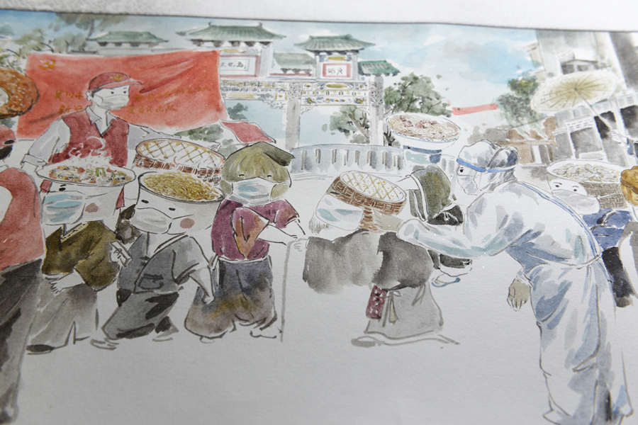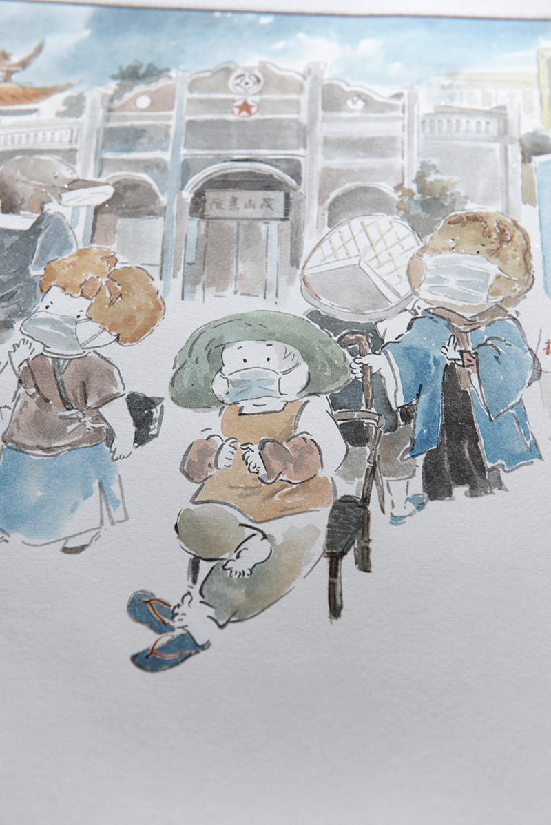 “吳川卷寄托的是我對家鄉的思念,所以在構圖上也會更直白一些,就是用長卷的形式,把大家排隊做核酸的場景表現出來!标愔窘芙忉屨f。