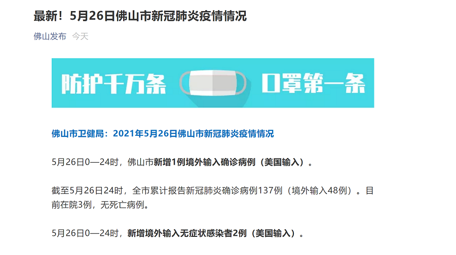 央廣網佛山5月27日消息(記者 周羽 鄭澍)5月27日,據佛山市衛健局消息,5月26日0—24時,佛山市新增1例境外輸入確診病例(美國輸入)。