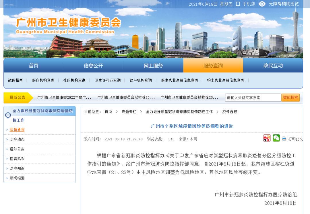 6月18日晚,廣州市衛(wèi)健委網(wǎng)站發(fā)布關(guān)于廣州市個(gè)別區(qū)域疫情風(fēng)險(xiǎn)等級調(diào)整的通告,通告明確自2021年6月18日起,海珠區(qū)濱江街道沙地直街(21、23號)由中風(fēng)險(xiǎn)地區(qū)調(diào)整為低風(fēng)險(xiǎn)地區(qū)。其他地區(qū)風(fēng)險(xiǎn)等級不變。