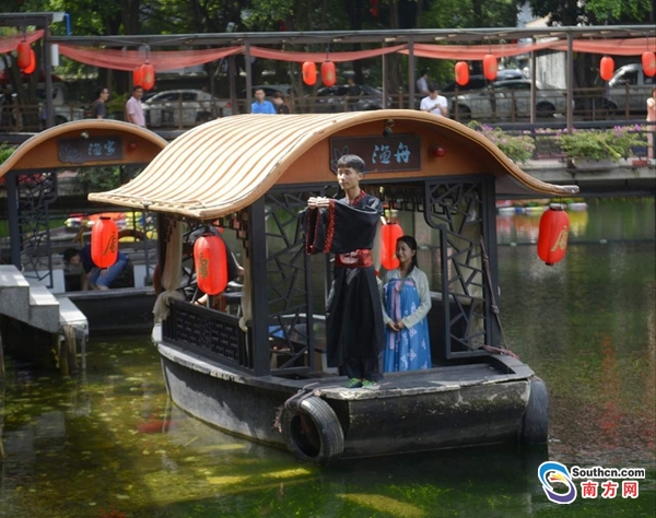 入場儀式過后,上演“彈絲樂禮”古箏彈唱表演,古代君王們功業成就才做樂,天下平定了才成禮。隨后接著的“嶺南舞韻”更是增添了宴會上的歡愉氣氛。在紅云宴期間湖面上還有緩緩行駛的一條船,船上一人舉酒杯,一人捧酒缽。船隨岸而行,每到坐客處即停。客人便取杯飲酒,將杯還給舉酒杯的人,捧酒缽人斟酒滿杯,船再前行。