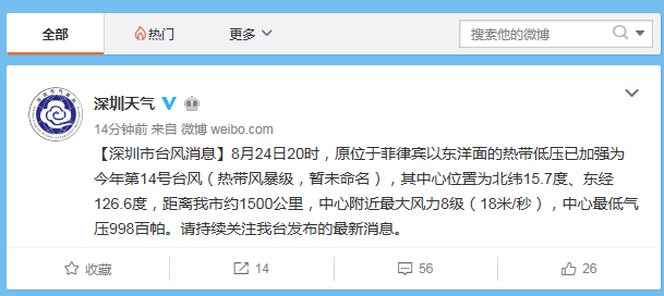 據深圳天氣微博消息,臺風“天鴿”剛走,又有一個新的熱帶低壓在菲律賓以東洋面生成,該熱帶低壓24日17時距離深圳1586公里。