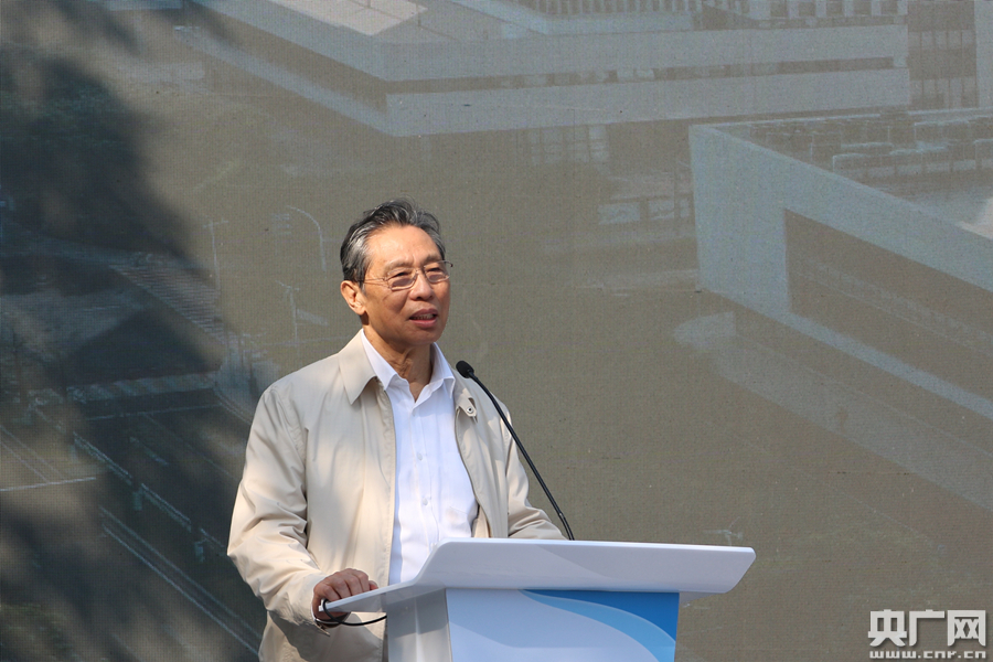 鐘南山院士在“廣州實驗室科技助力基層疫情防控萬里行”活動啟動儀式上發言。(央廣網記者 夏燕 攝)