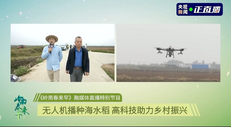直播中,記者走進江門市臺山市海宴鎮(zhèn),這里有著一片海水稻試驗田,農用無人機正在播撒海水稻種子,呈現出一派春耕景象。
