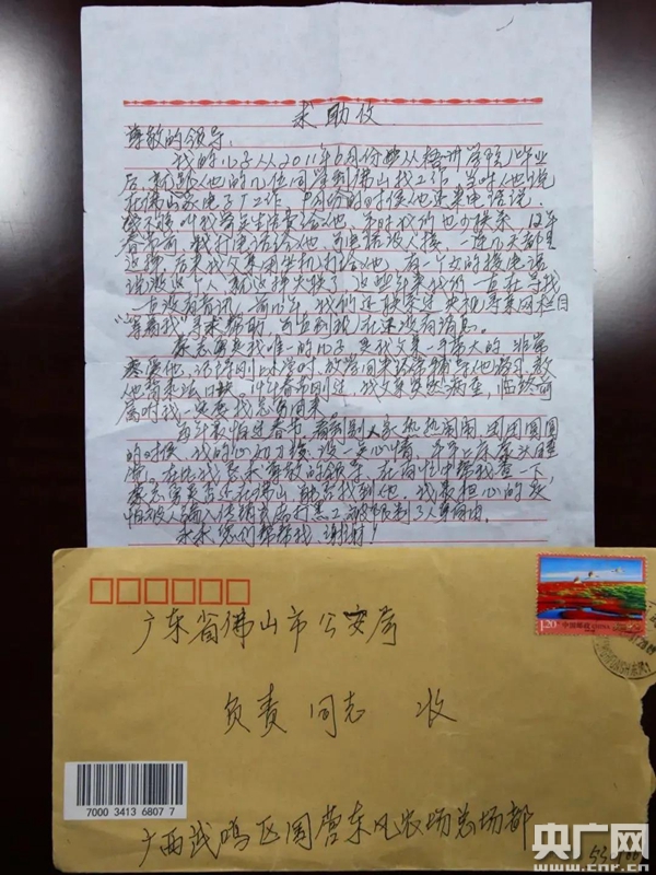 蒙乃政寄來的求助信。(央廣網(wǎng)發(fā) 佛山公安供圖)