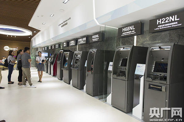 廣電運通行政樓大廳展示著各類功能不一的ATM機
