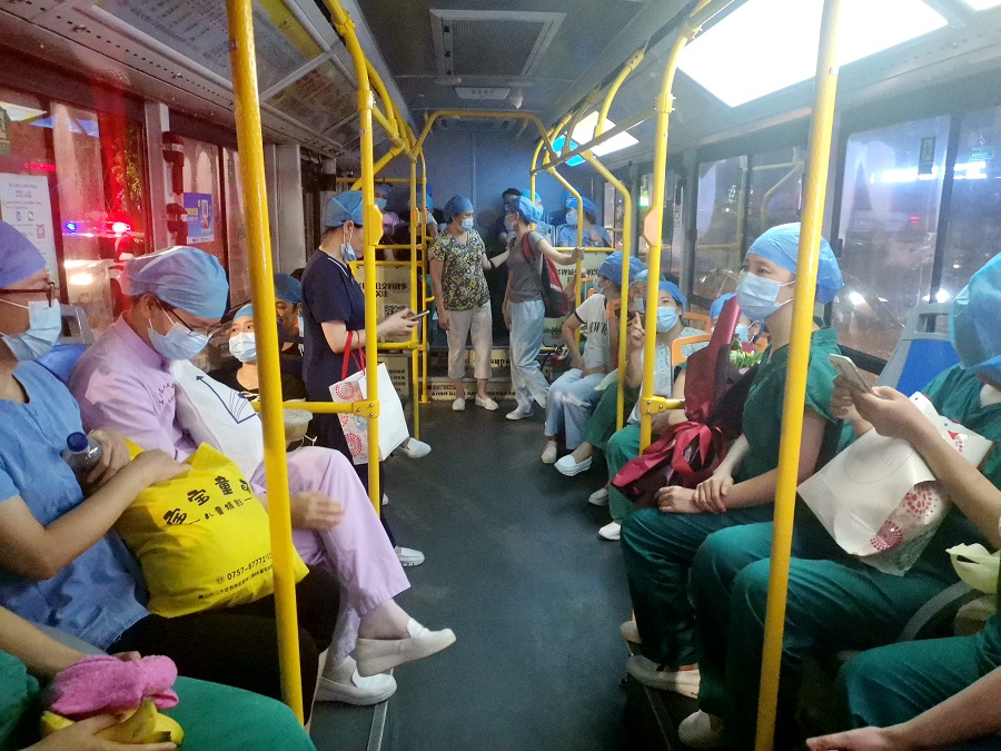 29日凌晨2點多,完成防控任務返家的兩名營運負責人途徑石灣街道辦,發現還有超過30名醫護人員仍在等待。詢問得知,原來已是深夜,醫護人員離開遇到困難。兩人馬上與公司溝通,派出一輛公交車前來接送。