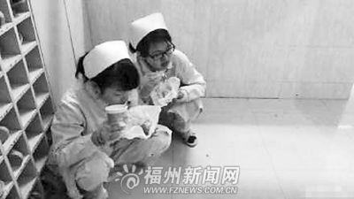 照片中,兩名年輕女護士正蹲在一個鞋柜旁,戴著一次性手套,埋頭吃快餐。該網(wǎng)友在微博上說,照片攝于福州一家醫(yī)院,這是這些護士的日常夜班狀態(tài),如果遇上大規(guī)模的意外事故,她們可能連飯也吃不上。