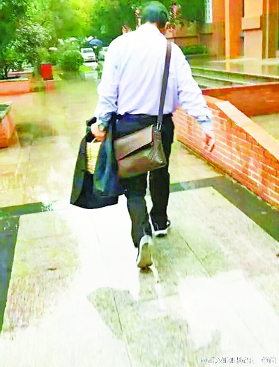 風(fēng)雨中,老師脫下西裝上衣,將學(xué)生們的作業(yè)包住,然后手提著作業(yè),匆匆趕往辦公樓。這一幕,恰好被身后的老師抓拍到,這張背影照,隨后在微信、微博上廣泛傳播。