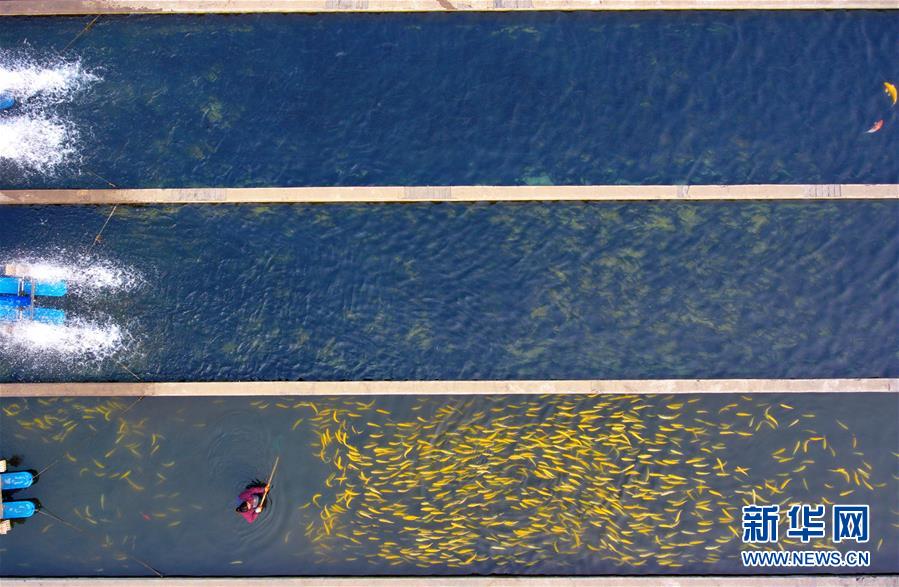 山西省平定縣娘子關(guān)鎮(zhèn)坡底村村民李海芳在養(yǎng)殖合作社內(nèi)撈魚(2月27日無人機拍攝)。