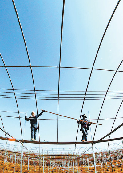 江蘇省沭陽縣錢集鎮(zhèn)致力于推動精準脫貧,今年計劃啟動10個高效農業(yè)扶貧項目。圖為錢集鎮(zhèn)農戶正在安裝大棚鋼架。丁華明攝(影像中國)
