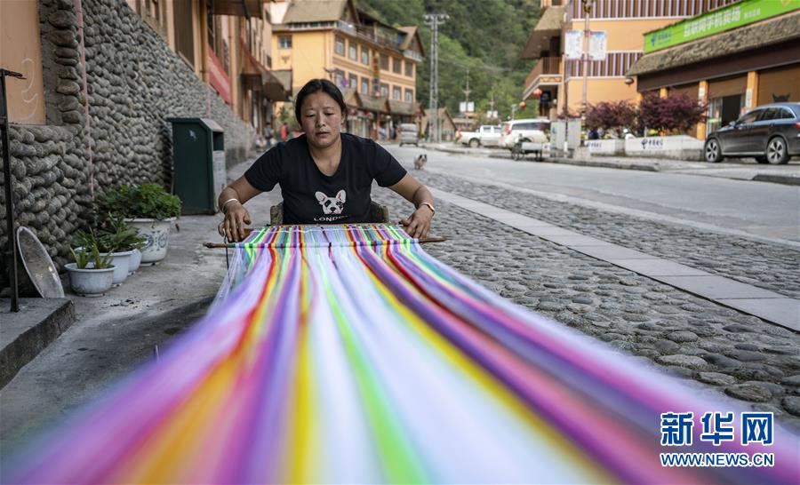 4月13日,云南省貢山縣獨龍江鄉村民和秋麗在家門口編織獨龍毯,她還在街邊開了一家燒烤店。