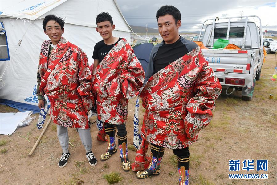 9月12日,藏族牧民身著盛裝參加青海省玉樹藏族自治州曲麻萊縣的首屆“教育節”。