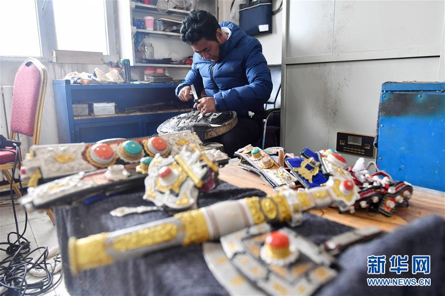 在200米之外的雕刻培訓班工作室,家族第七代金銀匠傳承人索南扎西正用小錘輕輕敲打著銀器。他對學生們的初期成果不甚滿意,試圖達到自己的出品標準。既是培訓教師,又是曲麻萊縣康朵諾澤藏族工藝品有限公司法人的他,出品的一把藏刀,可以賣到2萬元。