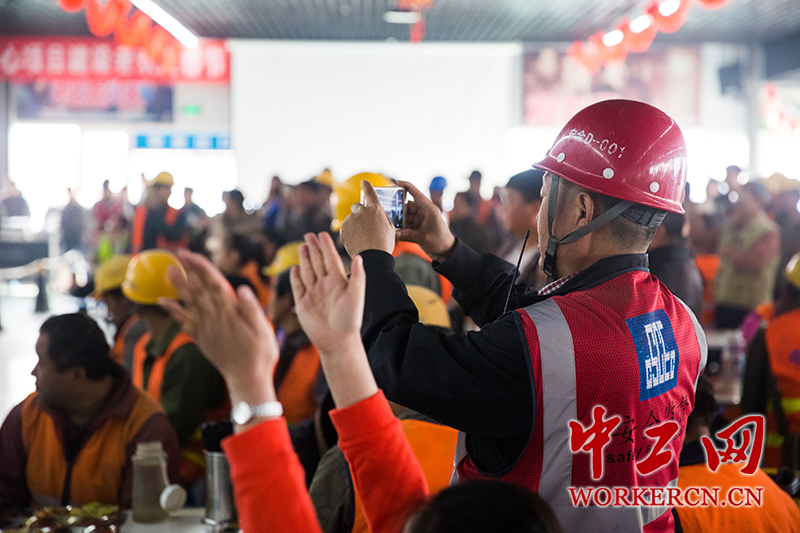 歌曲唱罷,一個人拿起喇叭喊話,“你干嘛呢?”另一個人拿著掃帚說,“我在學(xué)雷鋒呢”,話音剛落,從食堂的四面八方聚集一群演員,跳起了歡快的舞蹈。現(xiàn)場的農(nóng)民工兄弟紛紛拿出手機,記錄下這驚喜的一幕。“他們不知道從哪里冒出來的,太驚喜,太感動了,我已經(jīng)錄下來了,回家給我家里人瞧瞧”。這是現(xiàn)場的一位農(nóng)民工兄弟告訴主辦方的。現(xiàn)場,還有許多農(nóng)民工兄弟們被熱烈的氣氛鼓舞,與演員們一起互動,一起跳舞,一起歌唱,非常開心。 中工網(wǎng)記者李雪峰 攝 -