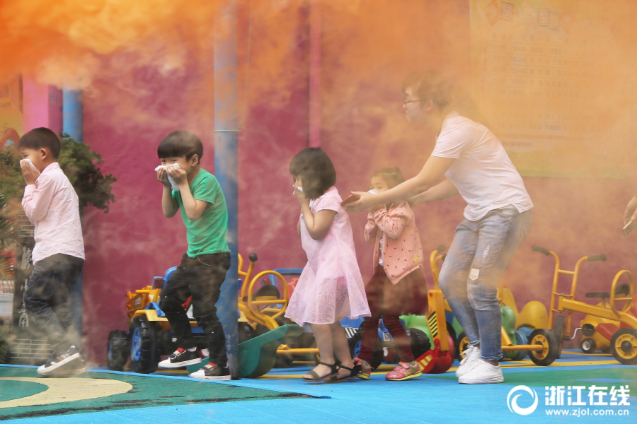 5月16日上午,蒼南舥艚邊防派出所民警在當(dāng)?shù)赜變簣@進(jìn)行消防疏散演練,為師生演示講解如何火場(chǎng)逃生以及使用滅火器等消防常識(shí)。(浙江在線(xiàn)拍友 周元斌 攝)
