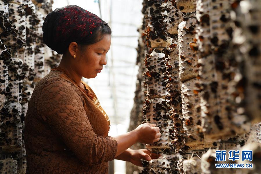 8月29日,在甘肅省臨夏回族自治州東鄉(xiāng)族自治縣高山鄉(xiāng)布楞溝村一扶貧基地,一名工人采收木耳。