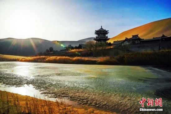 央廣網蘭州2月21日消息 羊年首日的朝陽灑在當地著名旅游景點鳴沙山月牙泉上,氣勢恢宏的月泉閣與波光粼粼的月牙泉交相輝映。滑沙、騎駱駝登山、乘直升機鳥瞰敦煌大漠全景……絡繹不絕的游客在眼前醉人的大漠風景里盡享新春的喜悅。王斌銀 攝