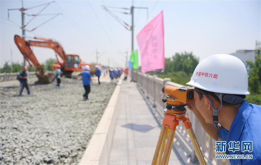 河北省懷來縣境內的新建京張高鐵跨大秦鐵路線土木特大橋連續梁在轉體中。新華社記者 楊世堯 攝 中鐵十九局工程人員在京沈高鐵凌源南站進行鋪軌作業。新華社記者 楊青 攝 -