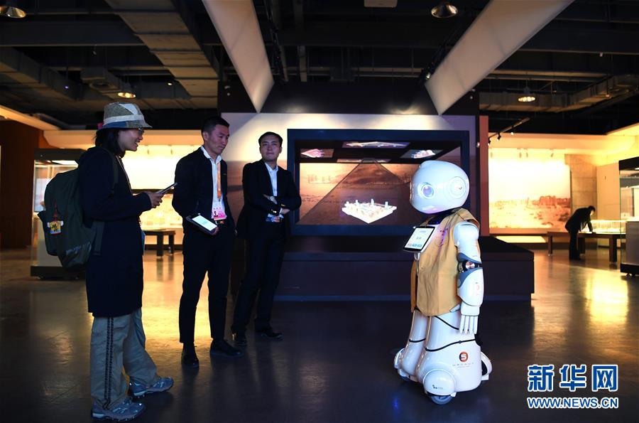•      9月27日,在敦煌國際會展中心,機器人為參觀者講解“古道天馬——絲綢之路上的交通”展覽。新華社記者范培珅 攝