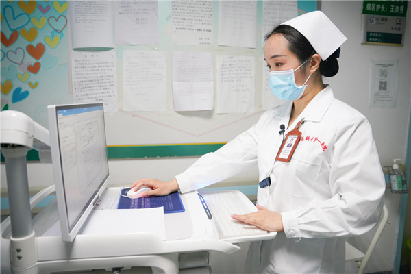 江淀淀在智能移動護理站查看病人信息(央廣網發 尚天宇攝)