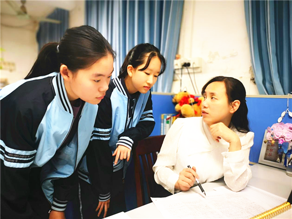 南寧市第十四中學語文教師、科研處主任蘇家珍(右一)指導學生寫作文(央廣網發 農顯峰攝)