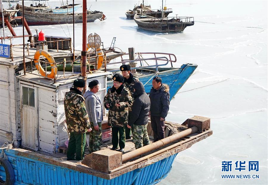 •      1月29日,河北省秦皇島邊防支隊北戴河邊防派出所官兵在轄區漁船碼頭提醒漁民寒潮冰期安全事項。新華社記者 楊世堯 攝