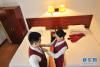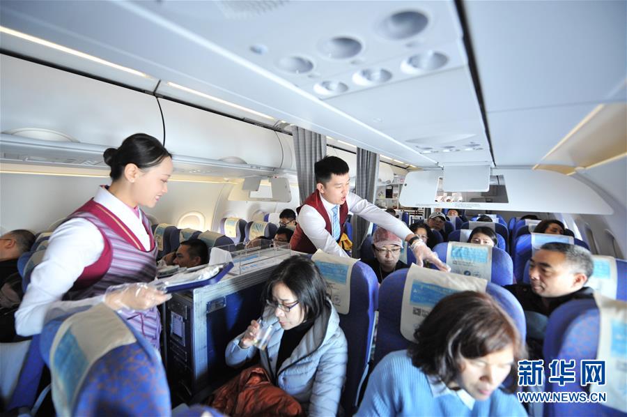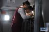 2月1日,寧儒和梁鶴在航班上為乘客服務(wù)。新華社發(fā)(楚洪雨 攝) -