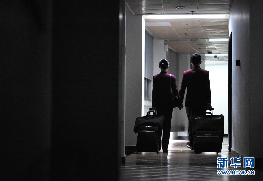 2月1日,在南航海口美蘭基地,寧儒(右)和梁鶴手牽手一起執(zhí)行航班任務(wù)。新華社發(fā)(楚洪雨 攝) -