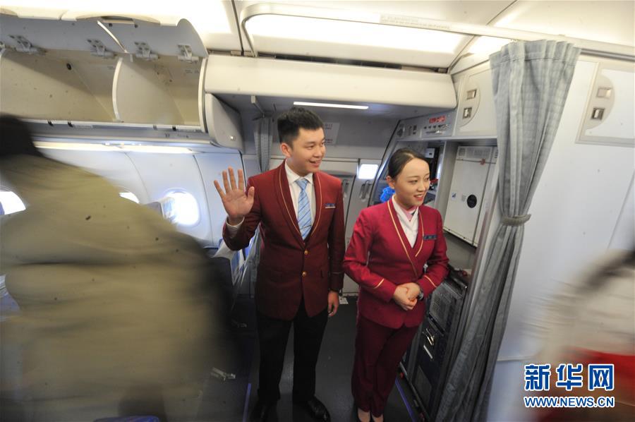 2月1日,寧儒(左)和梁鶴在航班上迎接乘客登機(jī)。新華社發(fā)(楚洪雨 攝) -