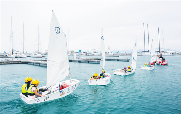 三亞半山半島帆船港附近海域,孩子們在學習操作帆船。 本報記者 武威 通訊員 董香云 攝