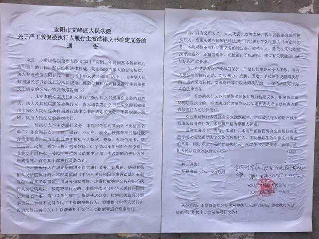安陽市文峰區法院對于這些“失聯”等暫時通知不到的“老賴”,巧妙應對,開始在“老賴”的住所地、戶籍地張貼通告,敦促“老賴”履行裁判義務,告知其若仍不主動到法院履行義務,將會對其采取錄入“失信黑名單”、罰款、拘留等強制措施,在符合條件情況下,還要追究其拒不履行生效裁判文書的刑事責任。