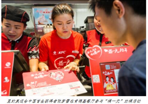 “傳播公益是一種愛(ài)。我希望讓家人、周邊的朋友和百勝中國(guó)的顧客和員工一起,參與到‘捐一元’的公益項(xiàng)目中!鼻淙菖勘硎荆骸拔覀円米约旱男袆(dòng)讓孩子和更多的人能明白,人幸福的時(shí)候,更要懷揣感恩與憐憫之心。生活有許多不易之處,但彼此心里有愛(ài)、互相幫助,艱難的情況就會(huì)有所改善,生活的快樂(lè)也會(huì)隨之而來(lái)!