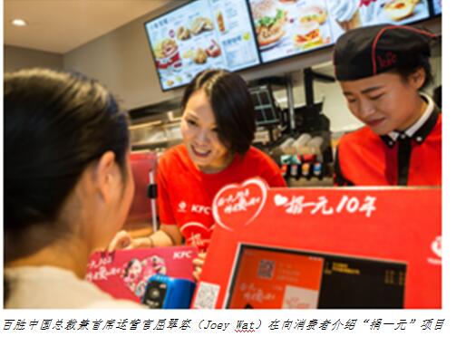 “捐一元”項(xiàng)目于2008年由中國(guó)扶貧基金會(huì)攜手百勝中國(guó)共同發(fā)起,號(hào)召顧客與員工捐出一元錢,為貧困地區(qū)孩子提供營(yíng)養(yǎng)加餐。