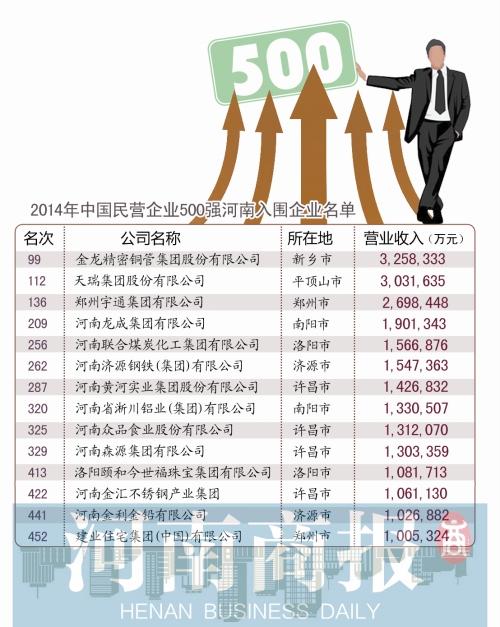 同時,據河南商報記者統計,共有14家豫企入圍2014年中國民營企業500強,其中,金龍精密銅管集團股份有限公司以325.83億元的營業收入位列河南榜單第一,天瑞集團、宇通客車分列二、三位。