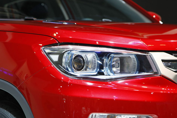 進(jìn)氣格柵的形狀見棱見角,大橫幅的設(shè)計(jì)看起來立體感十足。關(guān)鍵是畫龍點(diǎn)睛的雙筒形前大燈(氙氣大燈),也讓前臉顯得炯炯有神。比較特別的是,CS75并沒有采用長安傳統(tǒng)的“V”型LOGO,而是直接將“CHANGAN”的拼音作為標(biāo)識。當(dāng)然,這一點(diǎn)也并非長安首創(chuàng),在其它硬派SUV中也屢見不鮮。
