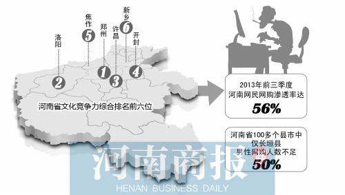 而據中原文化研究所助理研究員郭海蓉介紹,2013年前三季度,河南網民網購滲透率達56%,高于全國平均水平10.1個百分點。