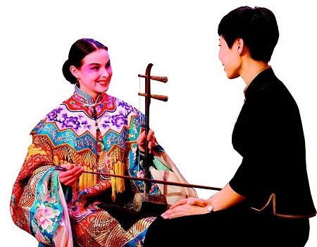 在演員、服裝師和琴師指導下,獨立電視臺著名主持人歐莉婭體驗了戲曲演員扮戲的過程:化好旦角的妝,再穿上《貴妃醉酒》里的戲服;水袖一甩,折扇掩面,舉手投足間頗有幾分味道;一轉頭,又有模有樣地拉起京二胡。只是,演出快要開鑼了,這位“洋貴妃”仍穿著一身行頭主持節目,急壞了青衣潘欣。