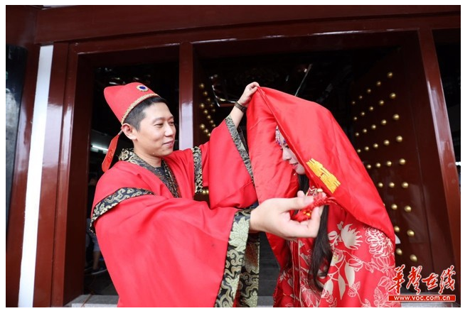 當(dāng)天下午,杜甫江閣上身著盛裝的“漢代小姐”款款移步繡樓檻前,含情脈脈地在眾人中搜尋一番后,最終將目光落在心儀的“郎君”身上,隨后面帶幾分羞澀,將手中的繡球凌空拋下,折回閨房。參與活動的“郎君”搶到繡球后,疾步登上繡樓。隨后,嗩吶聲四起,“新郎”與“新娘”牽著紅花球從南門口進(jìn)入,在丫環(huán)的攙扶下,一對“新人”在一片祝福聲中,舉行婚慶儀式。
