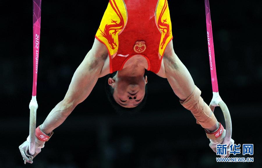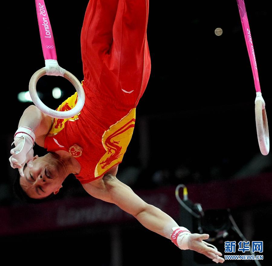 7月30日,中國選手陳一冰在吊環(huán)比賽中。當(dāng)日,在倫敦奧運(yùn)會體操男子團(tuán)體決賽中,中國隊(duì)獲得冠軍。 新華社記者王建華攝