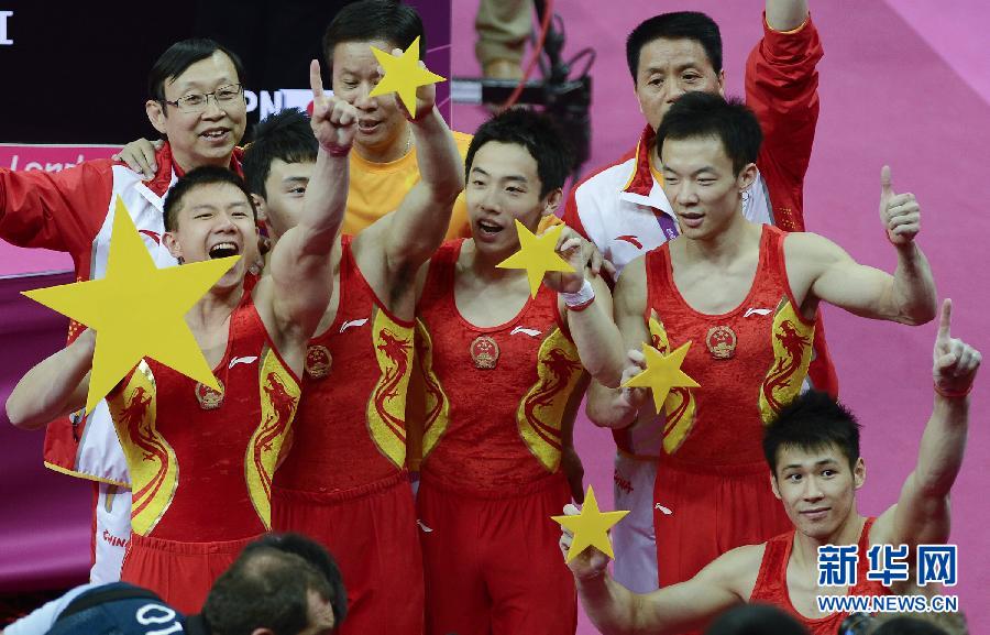 7月30日,中國體操隊(duì)隊(duì)員慶祝奪冠。當(dāng)日,在倫敦奧運(yùn)會體操男團(tuán)決賽中,中國隊(duì)以275.997分的成績成功衛(wèi)冕。 新華社記者戚恒攝